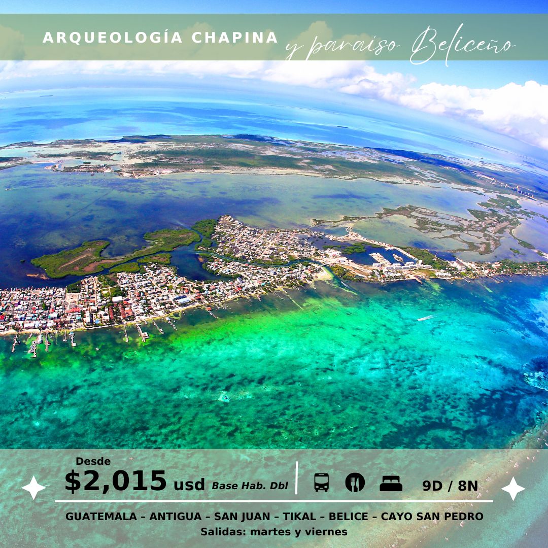 Desayuno. Salida hacia la frontera de Melchor de Mencos con Belice, luego de trámites migratorios, traslado hacia la Ciudad de Belice, para tomar el vuelo de línea aérea doméstica hacia Cayo San Pedro. Alojamiento.