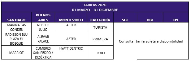• Tarifas dinámicas en USD sujetas a reconfirmación al momento de la reserva y no aplican en fechas blackout por ferias, congresos o eventos.