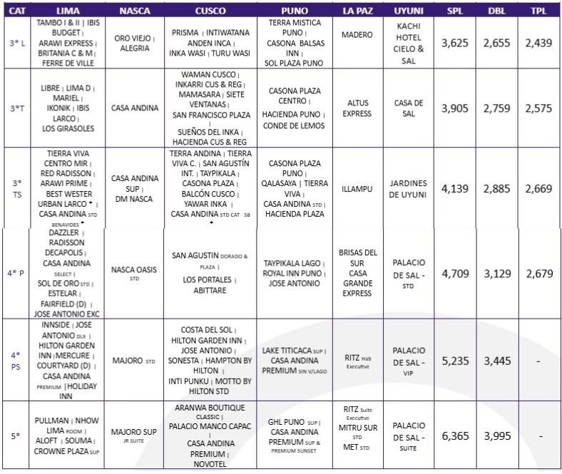 21:30 hrs: Al llegar a Lima, nuestro equipo nos espera para llevarnos al hotel, donde podremos descansar y reflexionar sobre las increíbles experiencias del día. Alojamiento en Lima.
