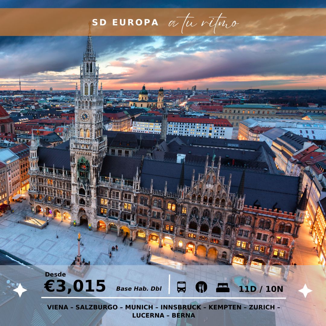 Desayuno. Después del desayuno visita de los mayores atractivos de la ciudad finalizando en la plaza principal “Marienplatz” para admirar el famoso carillón del ayuntamiento. Múnich, capital del estado de Baviera, es famosa por su Fiesta de la Cerveza “Oktoberfest“ que se celebra en el mes de septiembre. Resto del día libre para disfrutar de la ciudad por su cuenta. Alojamiento.